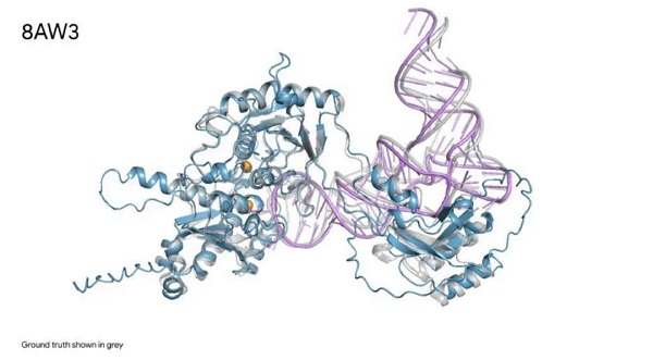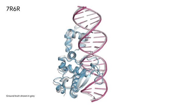 下图展示了AlphaFold3对蛋白质(蓝色)与DNA双螺旋(粉色)结合的分子复合物的预测,与真实分子结构(灰色)几乎完美匹配。