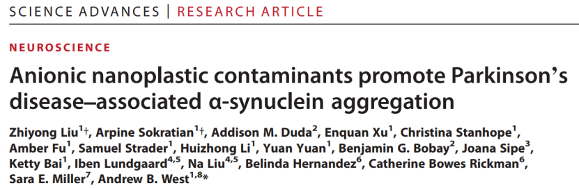 2023年11月17日,国际知名期刊Science Adances在线发表了一篇题为Anionic nanoplastic contaminants promote Parkinson’s disease–associated α-synuclein aggregation的研究文章,作者在这项研究中指出阴离子型聚苯乙烯纳米塑料与人类α-突触核蛋白的高亲和力结合促进了α-突触核蛋白的聚集,并在小鼠模型中显示了潜在的神经系统影响,提出了微塑料可能与帕金森病风险相关的新观点。