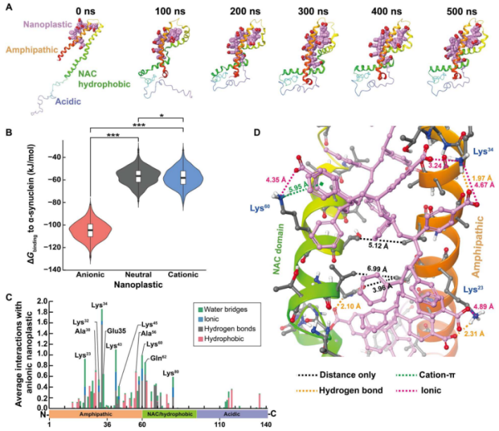 分子动力学模拟显示出了α-突触核蛋白与阴离子型纳米塑料能够形成稳定的复合物,且这种复合物的形成时特异性结合的结果,中性和阳离子型纳米塑料没有形成类似的稳定复合物,如图二所示。