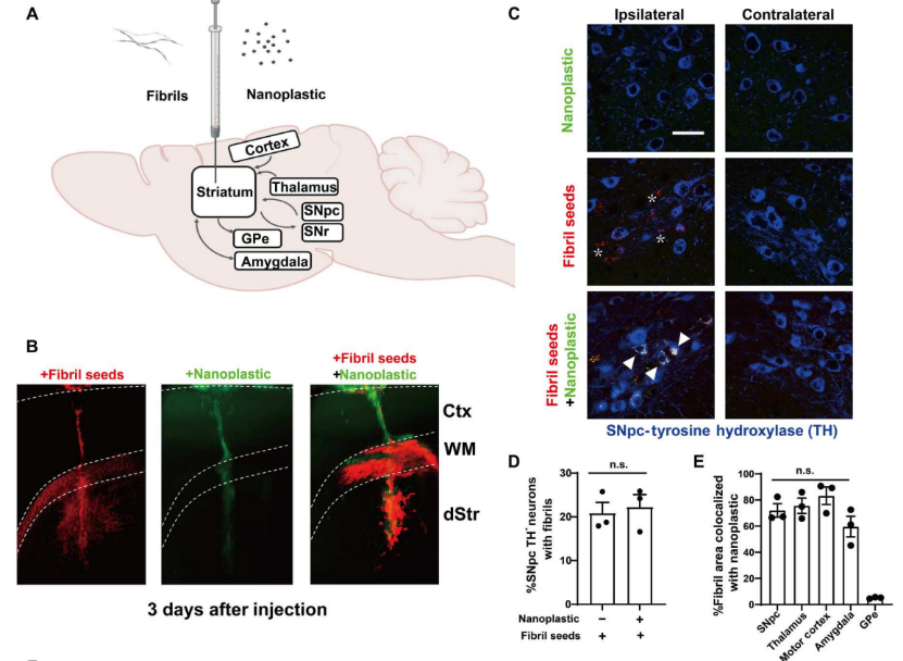 为了了解α-突触核蛋白纤维和阴离子聚苯乙烯纳米塑料污染物在大脑内的分布和运输模式,以及它们在共同注射的情况下对α-突触核蛋白的聚集和神经元病变的潜在影响。作者使用了非转基因的大鼠进行了造模实验,通过共聚焦分析,对注射到大鼠背侧纹状体的荧光标记(FITC)纳米塑料颗粒和α-突触核蛋白纤维的分布进行观察。结果显示,单独注射时,纤维和纳米塑料分布模式有所不同。联合注射后,纳米塑料和纤维的分布模式变得相似,且在多巴胺能神经元中观察到它们的共聚焦。联合注射还导致了α-突触核蛋白病变的显著增加,表明纳米塑料可能影响α-突触核蛋白的聚集和神经元病变。
