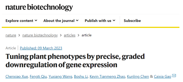 2023年3月9日,高彩霞团队在Nature Biotechnolgoy期刊发表了题为:Tuning plant phenotypes by precise, graded downregulation of gene expression 的研究论文。此前研究基础上,通过对上游开放阅读框(uORF)进行设计,开发了能够可预测地精细下调目标基因蛋白表达的新方法,为未来的分子设计育种提供了重要的技术手段。