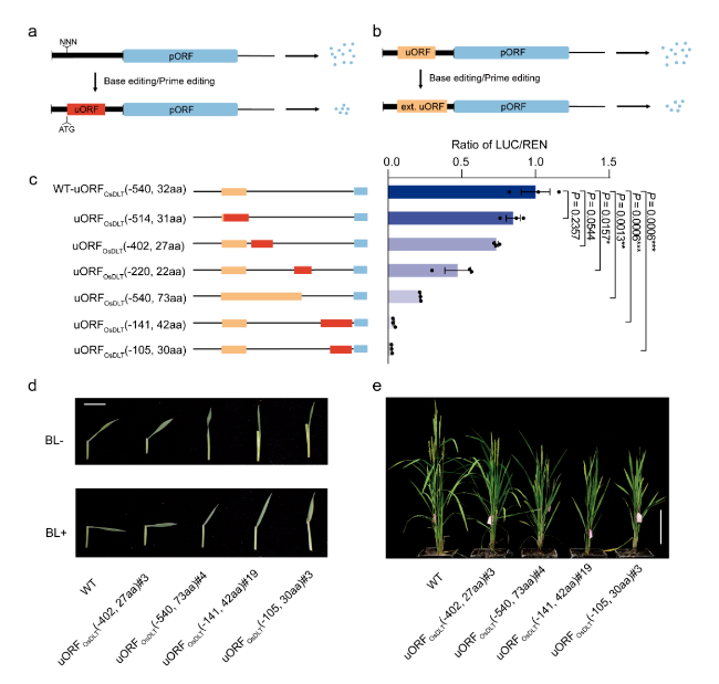 通过编辑uORF培育具有目标性状的水稻植株。(a, b)从头创制新的uORFs (a)或延伸内源uORFs (b)抑制目标基因的蛋白表达。(c)通过产生一系列具有不同抑制能力的uORFs梯度下调基因的表达。(d, e)含有uORFs变体的突变体对油菜素内酯的敏感性(d)和植株表型(e)。