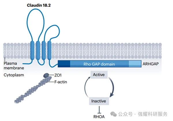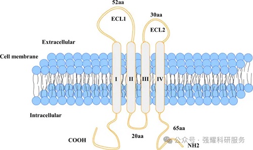 CLDN是一个至少包含27个跨膜蛋白的家族,根据序列的差异分为经典类型和非经典类型。CLDN18属于非经典类型,由细胞质的N端区域、两个细胞外环(ECL-1和ECL-2)、四个跨膜结构域和细胞质的C端尾部组成。