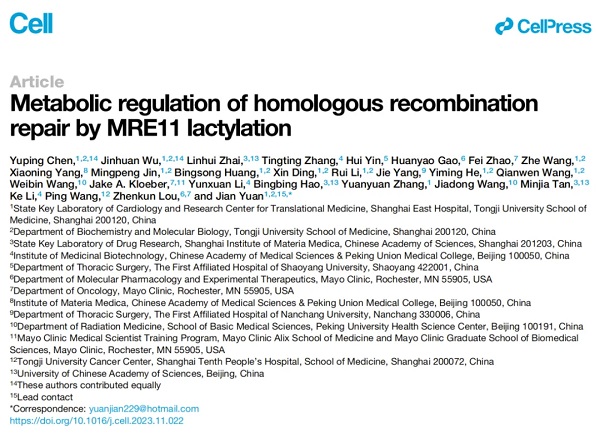 2023年12月20日,同济大学医学院/附属东方医院袁健团队在 Cell 期刊发表了题为:Metabolic Regulation of Homologous Recombination Repair by MRE11 Lactylation 的研究论文。