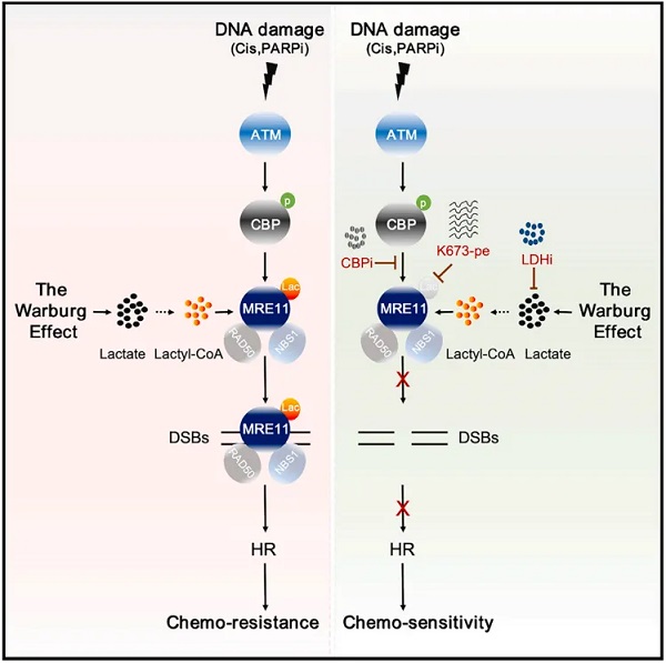 该研究揭示了 MRE11 乳酸化修饰对同源重组修复的代谢调节,发现在肿瘤细胞代谢中所产生的大量乳酸,成为肿瘤细胞的“帮凶”,帮助肿瘤细胞躲避化疗药物的杀伤,从而导致化疗耐药。