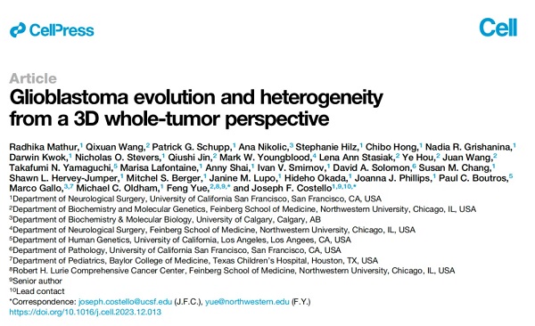 2024年1月18日,美国加州大学旧金山分校 Joseph Costello 团队与美国西北大学岳峰团队合作,在 Cell 期刊发表了题为:Glioblastoma evolution and heterogeneity from a 3D whole-tumor perspective 的研究论文。