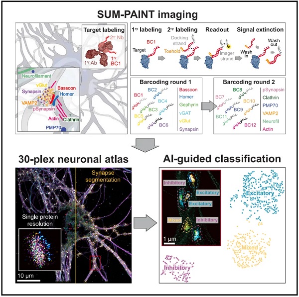 该研究开发了一种基于二级标签的无限制多重 DNA-PAINT 技术——SUM-PAINT,这是一种高通量成像方法,能够以优于 15 纳米的分辨率实现几乎无限制的多重成像。利用 SUM-PAINT 技术,研究团队在神经元中生成了 30 重单分子分辨率的数据集,并采用了受组学启发的分析方法来进行数据探索,从而得以揭示突触异质性的复杂性,并发现了一种独特的突触类型。