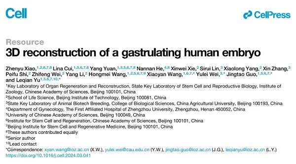 2024年4月23日,中国科学院动物研究所/北京干细胞与再生医学研究院于乐谦研究员、郭靖涛研究员、中国农业大学魏育蕾教授及中国科学院动物研究所王晓琰博士合作,在 Cell 期刊发表了题为:3D Reconstruction of a Gastrulating Human Embryo 的研究论文。