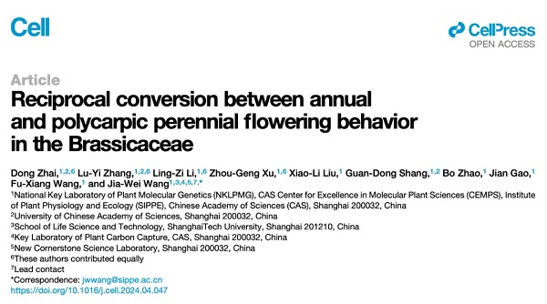 2024年5月28日,中国科学院分子植物科学卓越创新中心王佳伟团队在 Cell 期刊发表了题为:Reciprocal conversion between annual and polycarpic perennial flowering behavior in the Brassicaceae 的研究论文。