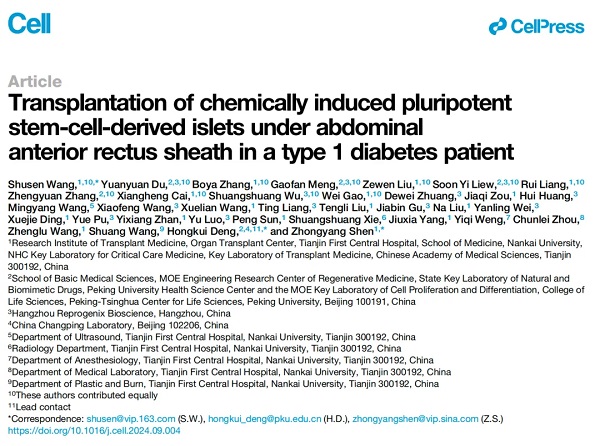 2024年9月25日,南开大学/天津市第一中心医院沈中阳、王树森团队、北京大学/昌平实验室邓宏魁团队与杭州瑞普晨创科技有限公司的研究人员合作,在 Cell 期刊发表了题为:Transplantation of chemically induced pluripotent stem-cell-derived islet under the abdominal anterior rectus sheath in a type 1 diabetes patient 的研究论文。
