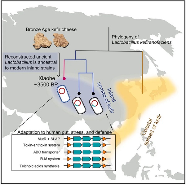 这项研究是世界首个古代奶制品遗存宏基因组研究。该研究发现古代开菲尔乳酸菌存在欧洲和东亚两个重要分支,且古代新疆开菲尔乳酸菌位于东亚分支基部,揭示出开菲尔乳酸菌及开菲尔酸奶制作工艺的另一独立的、从新疆传播至东亚内陆的新传播路线,为厘清新疆塔里木盆地古人群的生活方式及技术文化的交流发展提供了全新而独特的遗传学证据。
