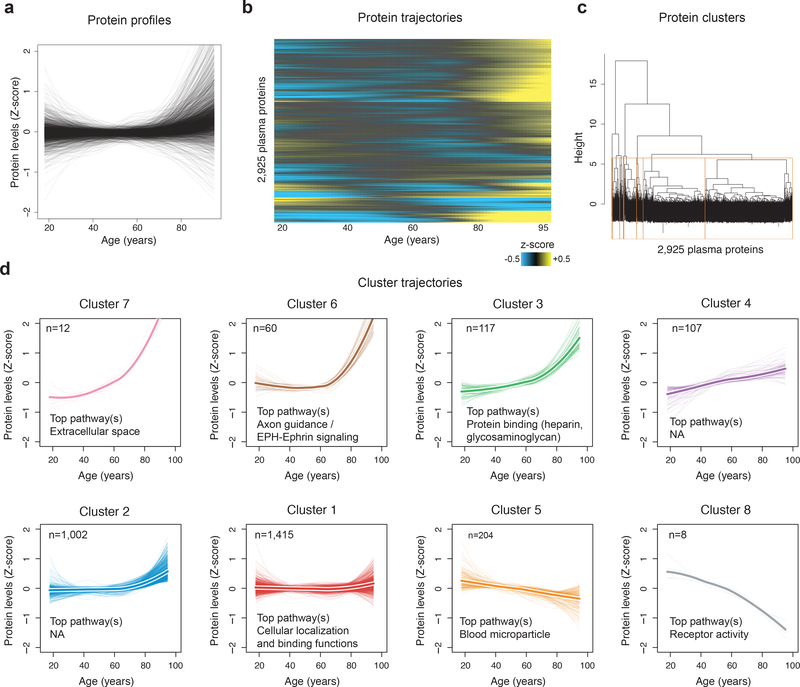 使用聚类对随年龄变化具有相似轨迹的蛋白质进行分组,得到了不同的蛋白质轨迹簇。其中,半数以上富集了特定的生物途径,这表明在生命周期中生物过程发生了明显但有协调的变化。换言之:大多数血浆蛋白质组在整个生命周期内的变化都是非线性的。