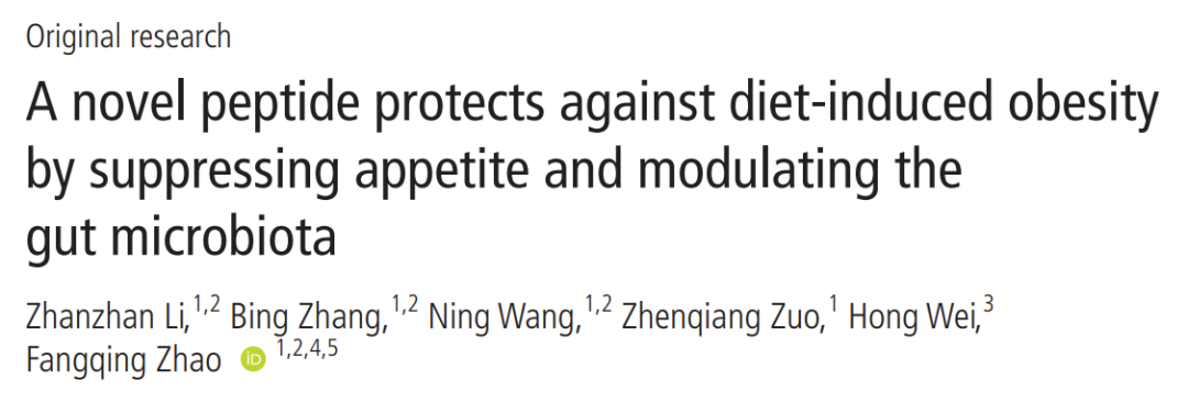 Zhao Fangqing's team from the Beijing Institute of Biological Sciences, Chinese Academy of Sciences, and Wei Hong's team from Army Medical University published a research paper in the journal Gut entitled A novel peptide protects against diet-induced obesity by suppressing appetite and modulating the gut microbiota.