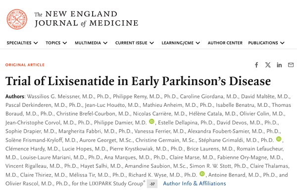 2024年4月3日,国际顶尖医学期刊《新英格兰医学杂志》(NEJM)发表了一篇题为:Trial of Lixisenatide in Early Parkinson’s Disease 的研究论文。