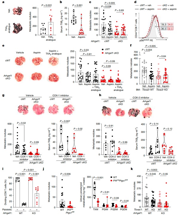 研究团队进一步证实,多种不同癌症(包括乳腺癌、黑色素瘤和结肠癌)的小鼠模型中使用阿司匹林、选择性 COX-1 抑制剂或血小板特异性敲除 COX-1,以依赖于 T 细胞内在 ARHGEF1 表达和体内 TXA2 信号传导的方式降低了癌症转移率。
