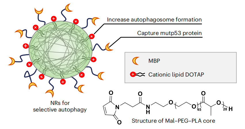 一方面,纳米受体(NR)表面的mutp53结合肽(MBP)靶向并结合到mutp53。另一方面,阳离子脂质DOTAP通过诱导自噬体形成增加来提高自噬水平,并协助将纳米受体结合的mutp53带入自噬小体。这些纳米受体在体外和患者来源的异种移植(PDX)卵巢癌模型中得到证实。